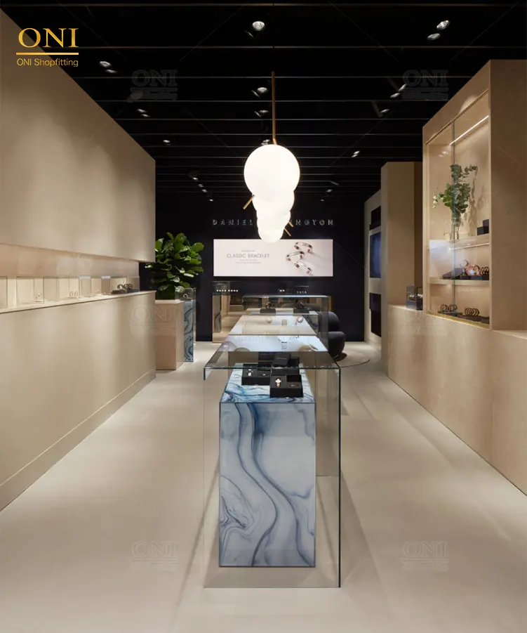 The ONI Shopfitting watch display cabinets feature a refined combination of marble-pattern bases, clear glass showcases, and warm champagne wood finishes, creating a sophisticated retail presentation environment for premium timepieces. Designed for modern watch store fixtures, these cabinets enhance product visibility while maintaining a clean and elegant spatial layout. The central glass island works perfectly with surrounding watch display stands, forming a complete watch shop display solution suitable for luxury boutiques and shopping mall counters. Ideal as a luxury watch display system, these watch display cabinets provide both functionality and brand-level presentation impact for high-end retail environments.